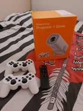 I bought two of these devices and was very lucky. The store's description matched the projector's features. It works excellently and comes with a wide variety of fighting games, including street fighter and king of fighters. The playstation-like controllers are wireless and use two aaa batteries each. I would buy it again.